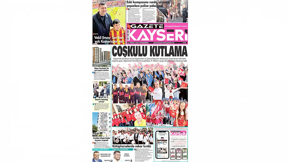 Gazete Kayseri manşetinde 23 Nisan kutlamalarına yer verdi. ‘Coşkulu kutlama’ başlığı ile servis edilen haberde, Kayseri’de 23 Nisan Ulusal Egemenlik ve Çocuk Bayramı dolayısıyla düzenlenen etkinliklerin coşkulu geçtiği ön plana çıkarıldı.