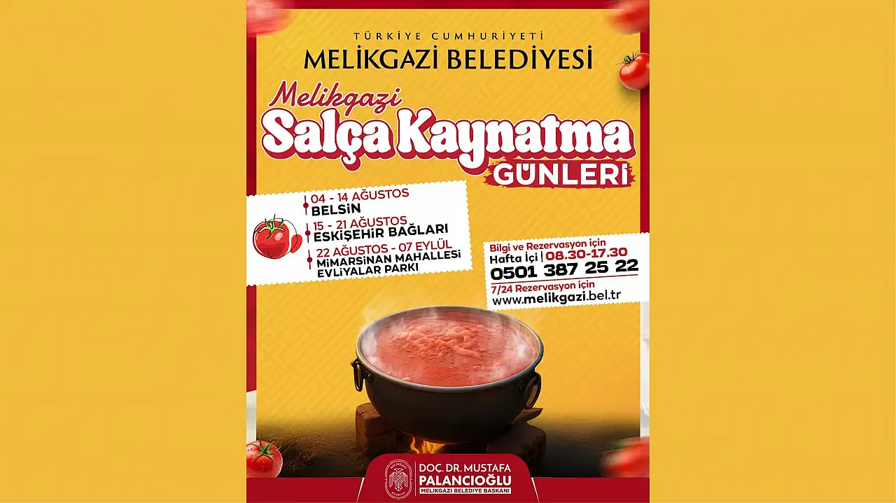 ‘Salça Günleri’ için randevu oluşturmak isteyen vatandaşlar 0501 387 25 22 numaralı hattı arayarak veya www.melikgazi.bel.tr internet adresini ziyaret ederek randevu alabilirler.