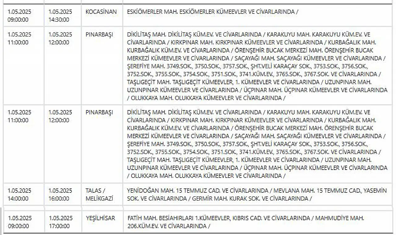 Kayseri'nin 5 ilçesine elektrik kesintisi uyarısı! 1 Mayıs 2025