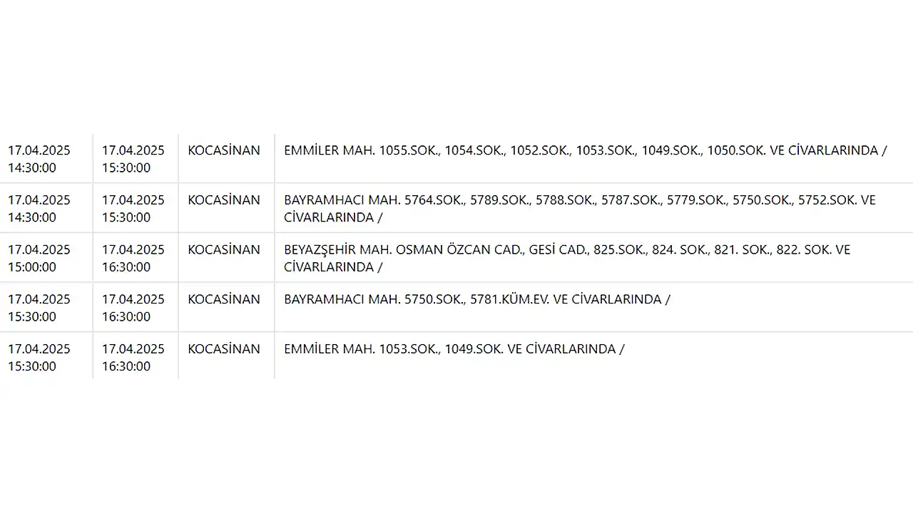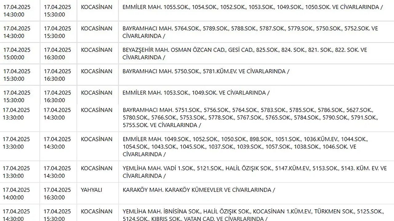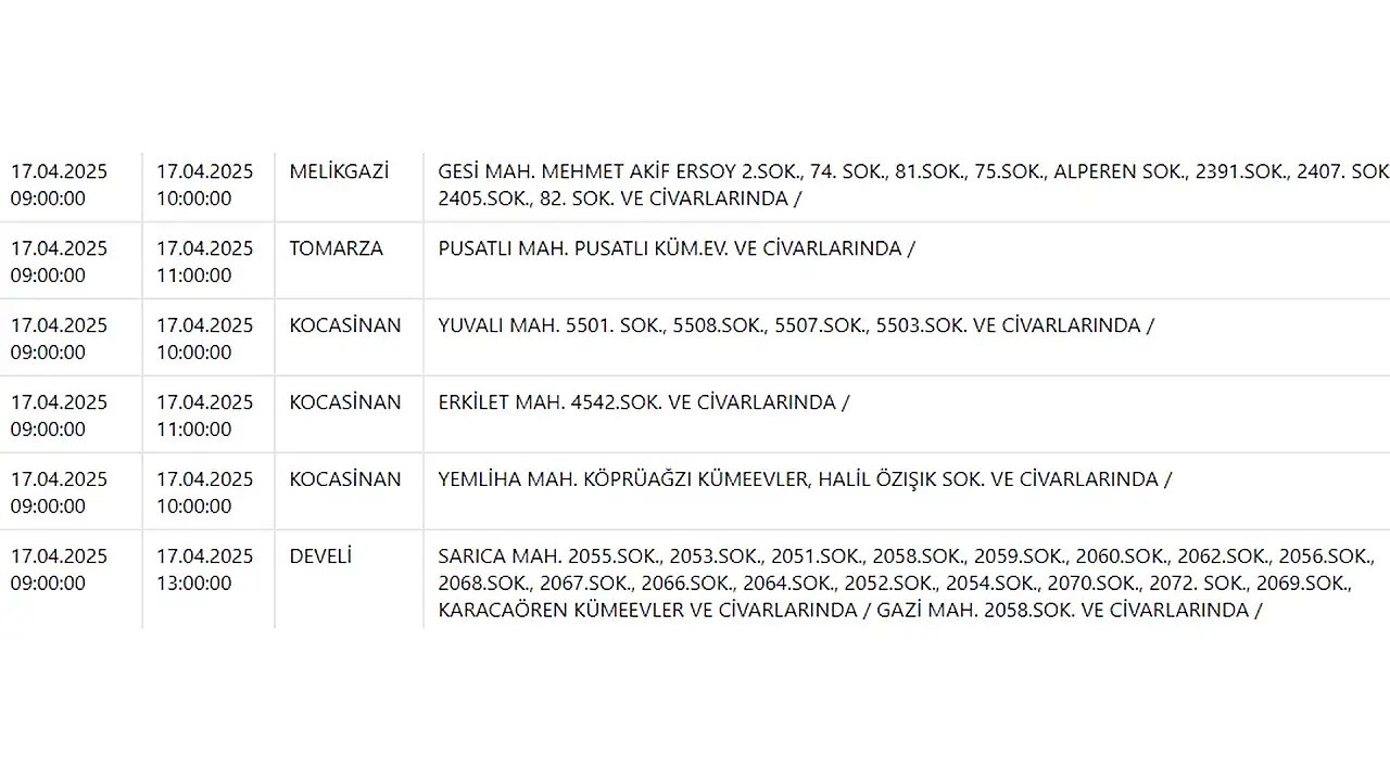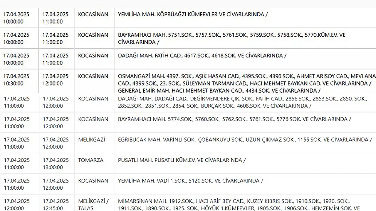KCETAŞ’tan edinilen bilgilere göre yarın (17 Nisan 2025) aşağıdaki mahallelerde elektrik kesintisi yaşanacak.