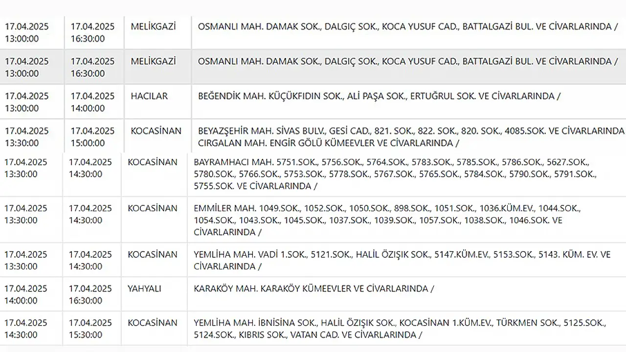 Kayseri'nin 8 ilçesinde dev elektrik kesintisi! 17 Nisan 2025