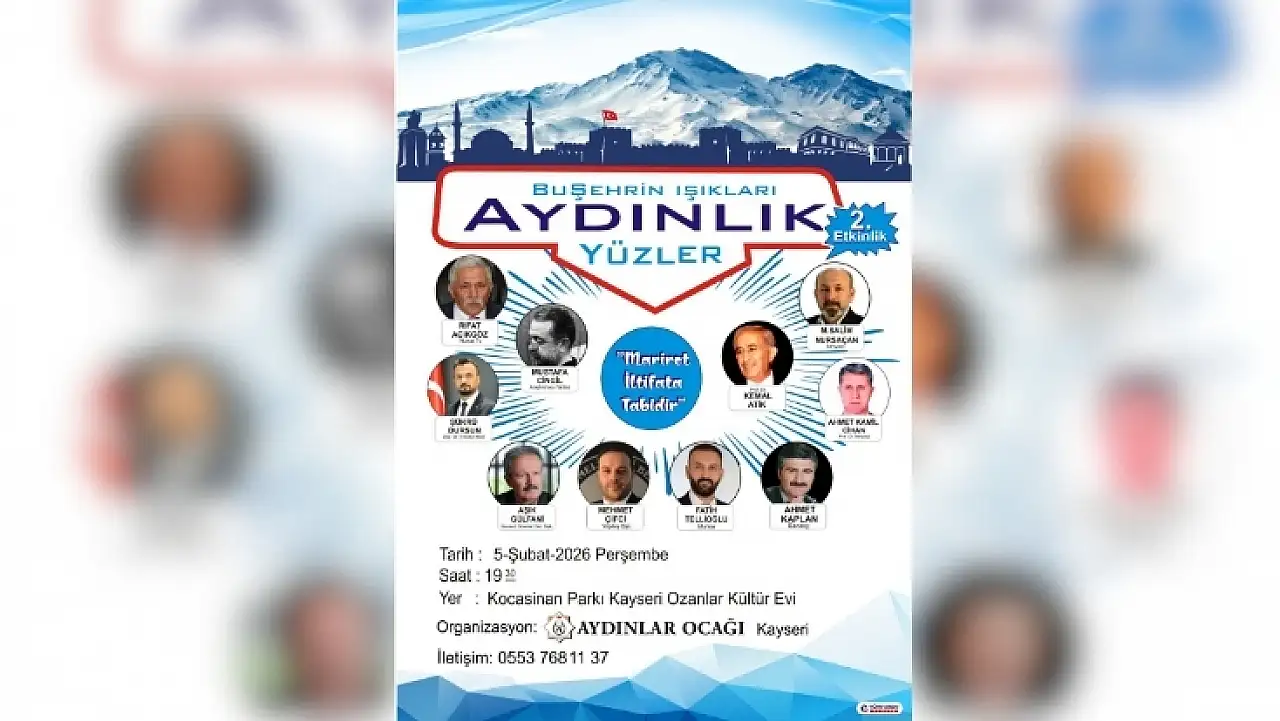 Kayseri’de kültür, düşünce ve sanat dünyasına katkı sunan isimleri bir araya getiren ‘‘Bu Şehrin Işıkları: Aydınlık Yüzler’‘ programının ikinci buluşması için geri sayım başladı. Aydınlar Ocağı Kayseri Şubesi tarafından organize edilen etkinlik, 5 Şubat 2026 Perşembe günü gerçekleştirilecek.