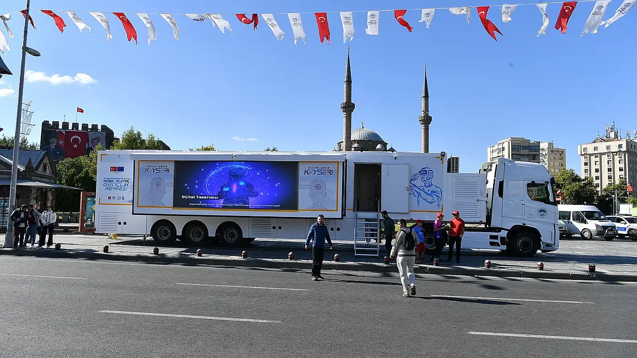 Kayseri Büyükşehir Belediyesi'nin gençlere dijital dünyanın kapılarını açacak 'Mobil Dijital Gençlik Merkezi' tanıtıldı. Tamamı Avrupa Birliği hibesiyle finanse edilen ve kendi enerjisini üretebilen bilim tırı, gençleri yazılım, yapay zekâ ve dijital pazarlama gibi geleceğin mesleklerine hazırlayacak.
