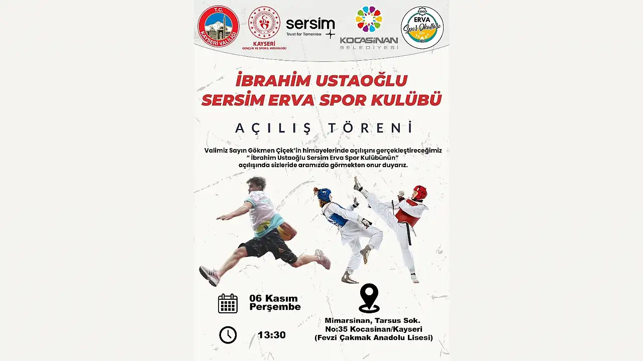 ERVA Spor Okulları kapsamında tefrişatı İbrahim Ustaoğlu SERSİM tarafından gerçekleştirilen Erva Spor Kulübü Fevzi Çakma Anadolu Lisesi’nde açılacak. Açılışa Kayseri Valisi Gökmen Çiçek ve kent protokolünden önemli isimlerin katılması bekleniyor.