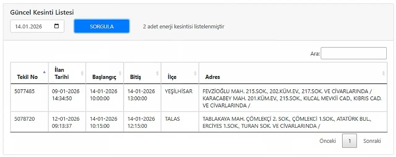 Kayseri'nin iki ilçesine elektrik kesintisi uyarısı! 14 Ocak 2026