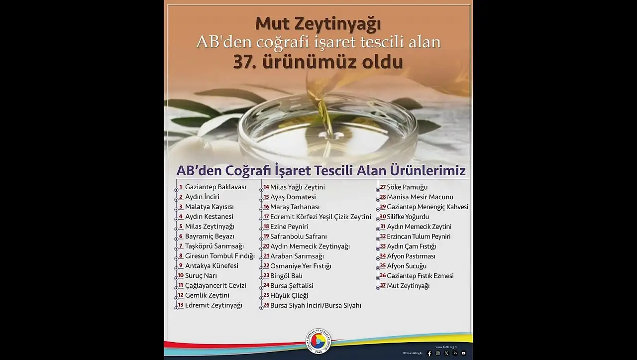 Türkiye Odalar ve Borsalar Birliği (TOBB) Başkanı Rifat Hisarcıklıoğlu, Türkiye’de AB’den coğrafi işaret tescili alan ürünleri paylaştı. Listede Kayseri’ye ait hiçbir ürünün henüz yer almaması nedeniyle adeta beklemeye alındı.