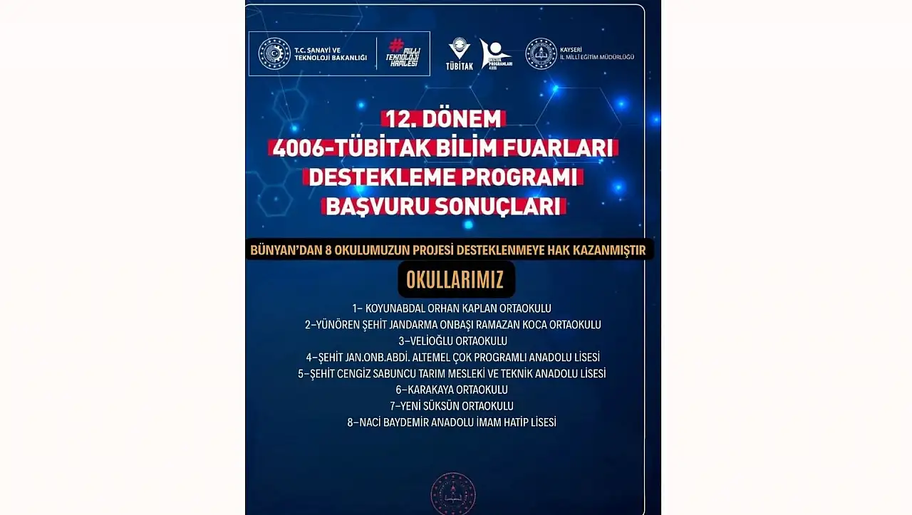 Bünyan İlçe Milli Eğitim Müdürlüğünce yapılan açıklamada, ‘’ 12. Dönem 4006-TÜBİTAK Bilim Fuarları Destekleme Programı kapsamında Bünyan’dan 8 okulumuzun projesi desteklenmeye hak kazanmıştır. Emeği geçen idarecilerimizi, öğretmenlerimizi ve öğrencilerimizi tebrik ederiz.’’ ifadeleri yer aldı.