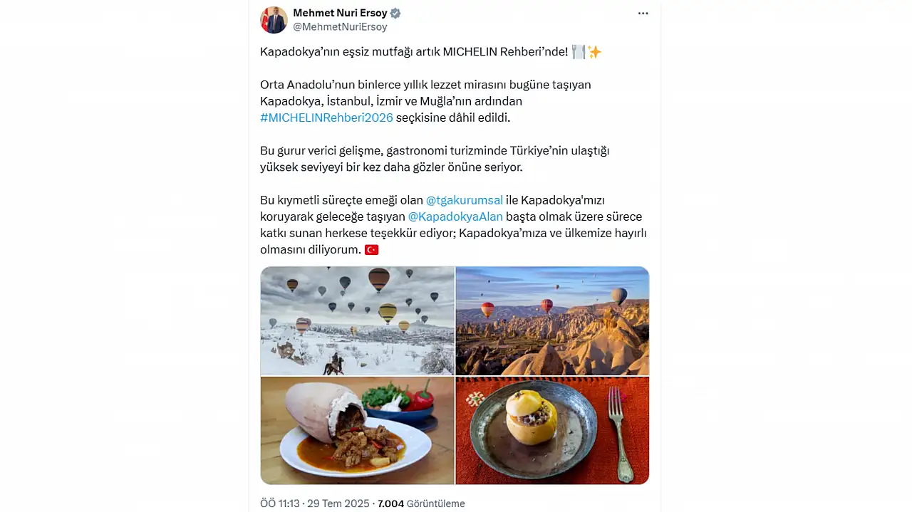 Kültür ve Turizm Bakanı Mehmet Nuri Ersoy, sosyal medya hesabından yaptığı açıklamada, Kapadokya'nın artık MICHELIN Rehberi'nde yer aldığını duyurdu.