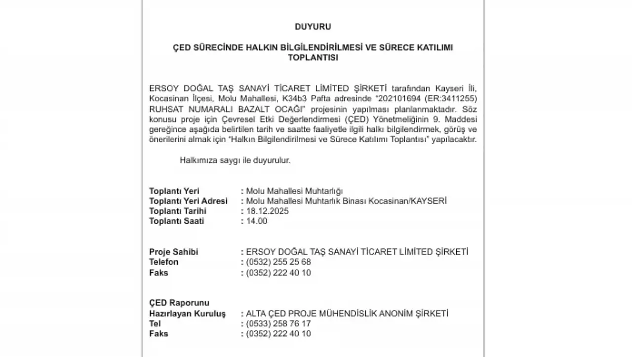 Çevresel Etki Değerlendirmesi (ÇED) sürecinde halkın bilgilendirilmesi ve sürece katılım toplantısı ile ilgili vatandaşa yapılan duyuruda şu ifadeler yer aldı, ‘’ERSOY DOĞAL TAŞ SANAYİ TİCARET LİMİTED ŞİRKETİ tarafından Kayseri İli, Kocasinan İlçesi, Molu Mahallesi, K34b3 Pafta adresinde ‘202101694 (ER:3411255) RUHSAT NUMARALI BAZALT OCAĞI’ projesinin yapılması planlanmaktadır. Söz konusu proje için Çevresel Etki Değerlendirmesi (ÇED) Yönetmeliğinin 9. Maddesi gereğince aşağıda belirtilen tarih ve saatte faaliyetle ilgili halkı bilgilendirmek, görüş ve önerilerini almak için ‘Halkın Bilgilendirilmesi ve Sürece Katılımı Toplantısı’ yapılacaktır. Halkımıza saygı ile duyurulur’’