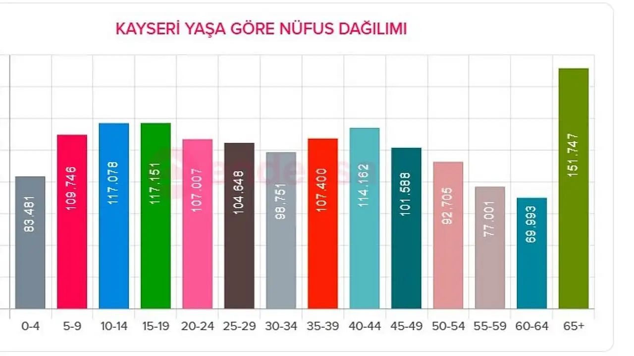 Endeksa tarafından yayınlanan veriler, Kayseri’deki nüfusun yaş gruplarına göre dağılımı ortaya çıktı. Buna göre, ilin en kalabalık yaş grubu 151.747 kişi ile 65 yaş ve üzeri vatandaşlardan oluşuyor. Bu grup Kayseri nüfusunun en büyük dilimini temsil ediyor.
