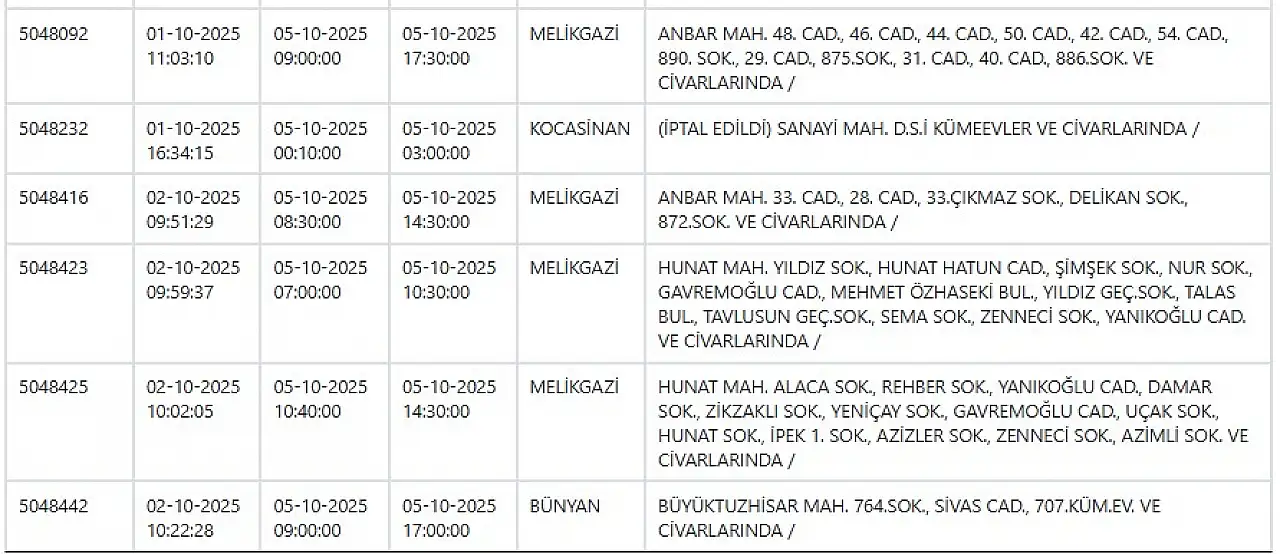 Kayseri'nin o bölgesinde elektrik kesintisi yaşanacak – 5 Ekim 2025