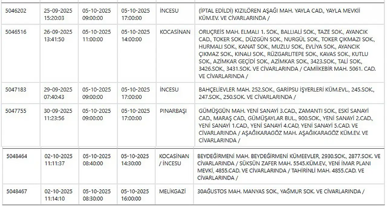 KCETAŞ’tan edinilen bilgilere göre yarın (5 Ekim 2025) aşağıdaki ilçe ve mahallelerde elektrik kesintisi yaşanacak.