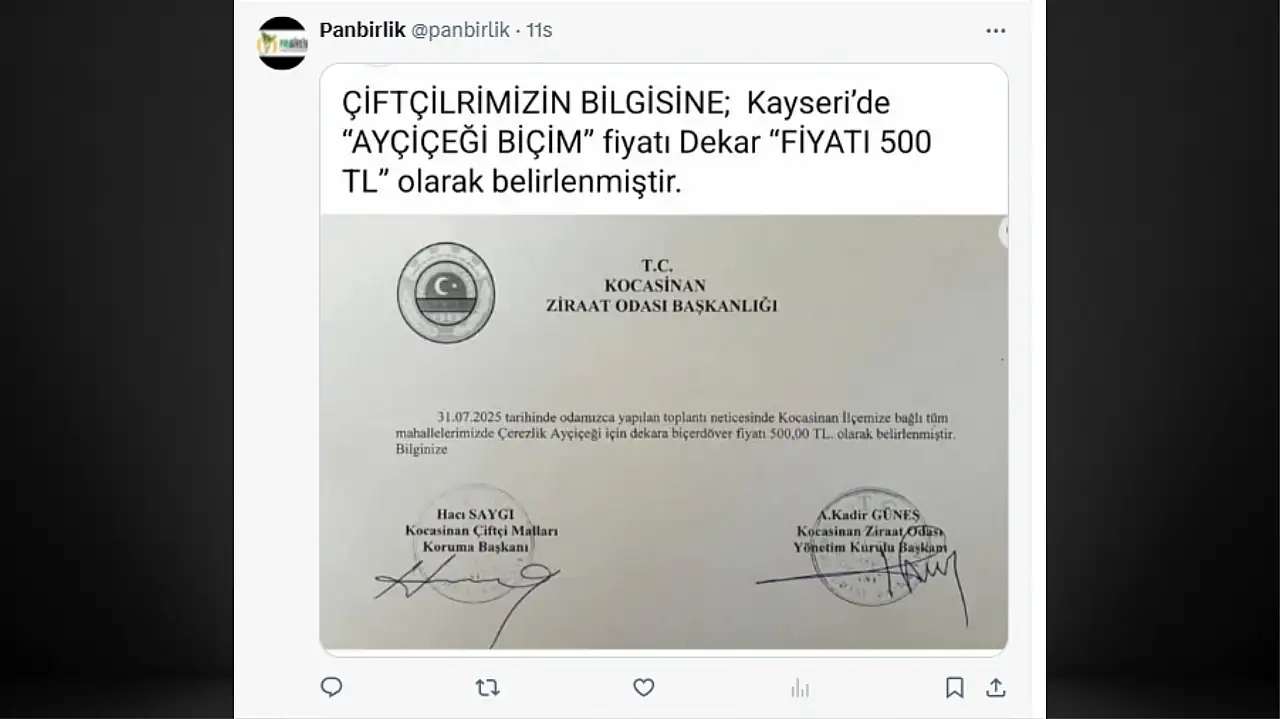 Kocasinan Ziraat Odası Başkanı Abdulkadir Güneş ve Kocasinan Çiftçi Malları Koruma Başkanı Hacı Saygı İmzası ile yayımlanan kararda: ‘’31.07.2025 tarihinde odamızca yapılan toplantı neticesinde Kocasinan İlçemize bağlı tüm mahallelerimizde Çerezlik Ayçiçeği için dekara biçerdöver fiyatı 500 TL olarak belirlenmiştir.'' ifadeleri yer aldı.