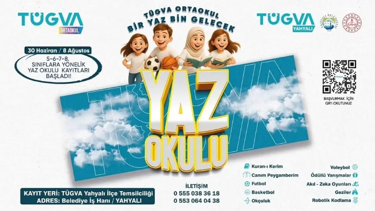 Yaz okuluna kayıtlar TÜGVA Yahyalı İlçe Temsilciliği'nde (Belediye İş Hanı) yapılacak. Detaylı bilgi ve başvuru için 0555 038 36 18 ve 0553 064 04 38 numaralı telefonlar üzerinden iletişime geçilebilir. Dileyenler, hazırlanan QR kodu okutarak da başvurularını kolaylıkla tamamlayabilirler.