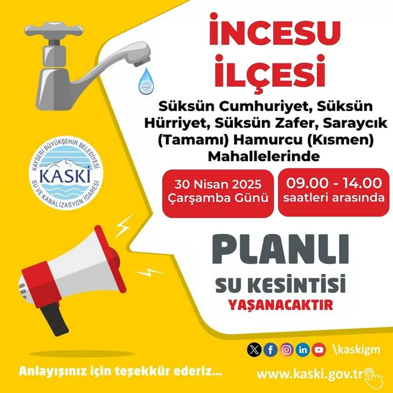 KASKİ tarafından yapılan açıklamaya göre İncesu İlçesi, Süksün, Cumhuriyet, Süksün, Hürriyet, Süksün Zafer, Saraycık(Tamamı) Hamurcu( Kısmen) Mahallerinde sular kesintisi yaşanacak.