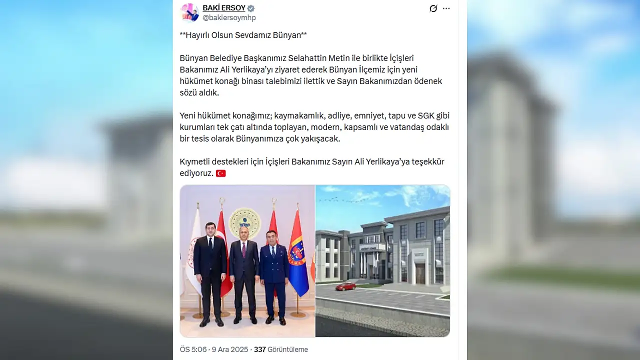 Vekil Ersoy paylaşımında: ‘’Bünyan Belediye Başkanımız Selahattin Metin ile birlikte İçişleri Bakanımız Ali Yerlikaya’yı ziyaret ederek Bünyan İlçemiz için yeni hükümet konağı binası talebimizi ilettik ve Sayın Bakanımızdan ödenek sözü aldık. Yeni hükümet konağımız; kaymakamlık, adliye, emniyet, tapu ve SGK gibi kurumları tek çatı altında toplayan, modern, kapsamlı ve vatandaş odaklı bir tesis olarak Bünyanımıza çok yakışacak. Kıymetli destekleri için İçişleri Bakanımız Sayın Ali Yerlikaya’ya teşekkür ediyoruz.'' ifadelerine yer verdi.