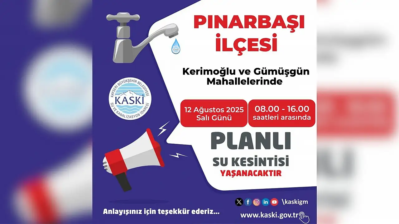 KASKİ’nin sosyal medya hesaplarından yapılan açıklamaya göre, ‘’Pınarbaşı ilçesi Kerimoğlu ve Gümüşgün Mahallelerinde içme suyu şebeke bağlantı çalışması nedeniyle 12.08.2025 (Salı) tarihinde 08.00 - 16.00 saatleri arasında planlı su kesintisi yaşanacaktır'' ifadelerine yer verildi.