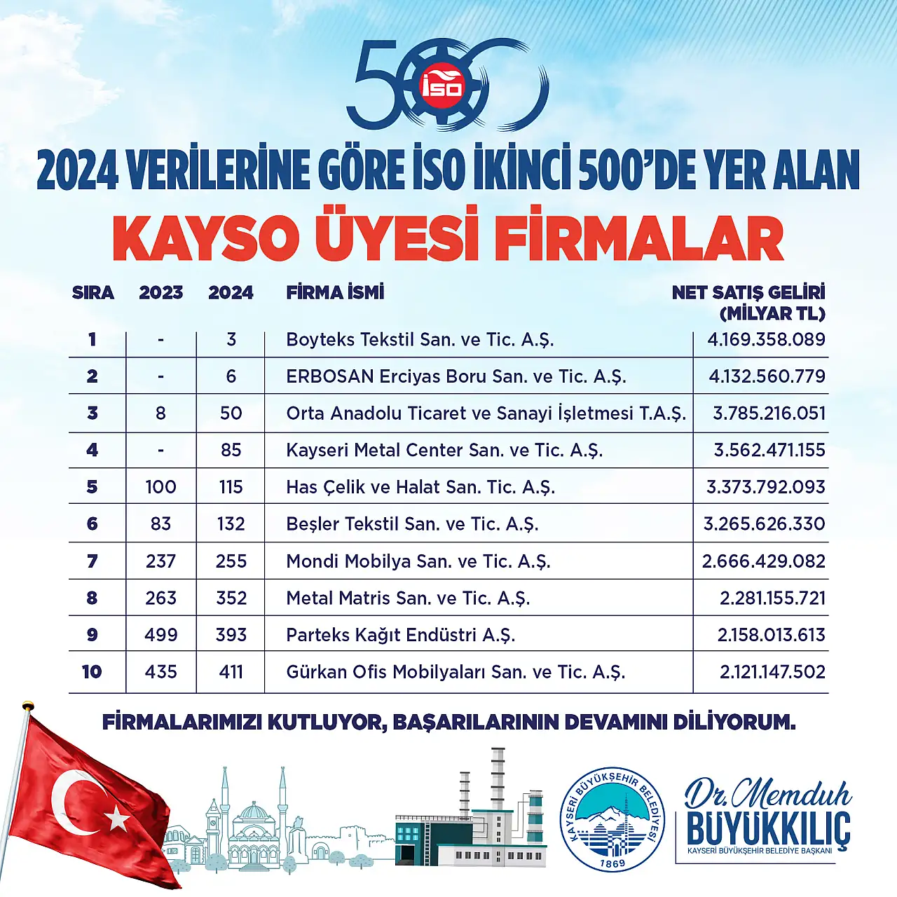 Kayseri Büyükşehir Belediye Başkanı Dr. Memduh Büyükkılıç, İstanbul Sanayi Odası'nın (İSO) açıkladığı 'Türkiye'nin İkinci 500 Büyük Sanayi Kuruluşu-2024' listesinde yer alan 10 Kayseri firmasını tebrik etti. Detaylar haberimizde...