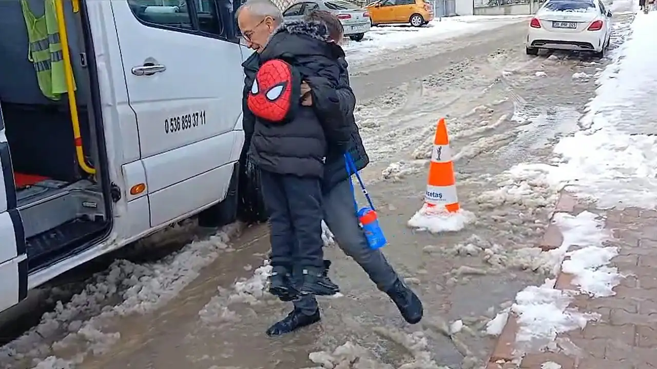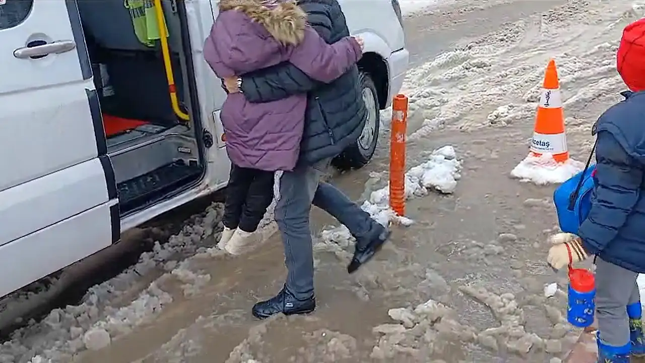 Yoğun kar ve su birikintisinin içerisinde olan servis şoförü çocukların güvenle araca binebilmesi için adeta kendisini siper etti. Ayak bileklerine kadar su içerisinde kalan şoför tüm öğrencilerin servise bindiğinden emin olduktan sonra yol boyunca uzanan su birikintisinin içerisinden çıktı.