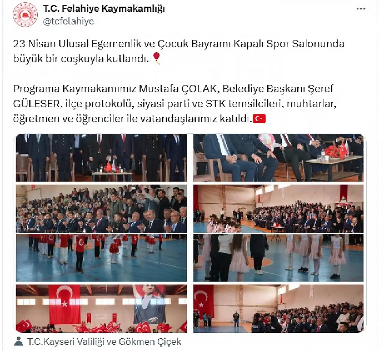 Felahiye'de düzenlenen etkinlere çok sayıda vatandaş katıldı yapılan paylaşımda: ‘23 Nisan Ulusal Egemenlik ve Çocuk Bayramı Kapalı Spor Salonunda büyük bir coşkuyla kutlandı. Programa Kaymakamımız Mustafa Çolak, Belediye Başkanı Şeref Güleser, ilçe protokolü, siyasi parti ve STK temsilcileri, muhtarlar, öğretmen ve öğrenciler ile vatandaşlarımız katıldı.’ ifadelerine yer verildi.