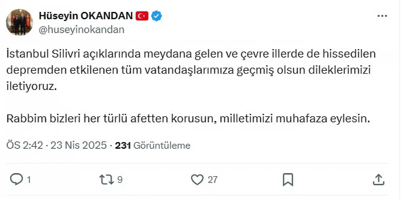 AK Parti İl Başkın Hüseyin Okandan, İstanbul'da yaşanan depremin ardından geçmiş olsun mesajı paylaştı. ‘İstanbul Silivri açıklarında meydana gelen ve çevre illerde de hissedilen depremden etkilenen tüm vatandaşlarımıza geçmiş olsun dileklerimizi iletiyoruz. Rabbim bizleri her türlü afetten korusun, milletimizi muhafaza eylesin’