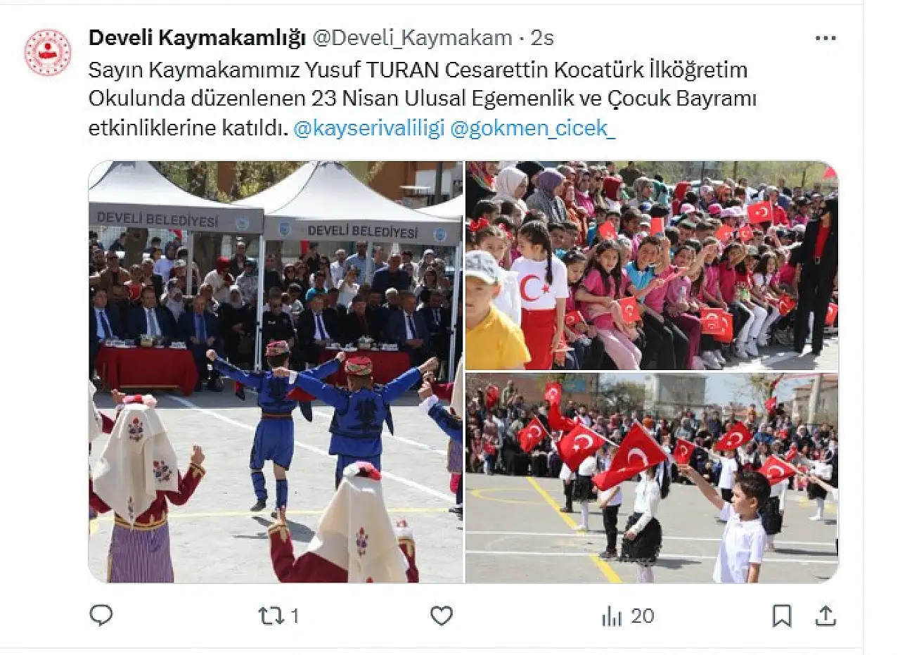 Kayseri'nin sosyal medya gündemini bugün 23 Nisan Ulusal Egemenlik ve Çocuk Bayramı oluşturdu. Kent genelinde çok sayıda etkinlik düzenlendi. İstanbul'da yaşanan depremin ardından ise geçmiş olsun mesajları geldi. Detaylar Kayseri Anadolu Haber'de...