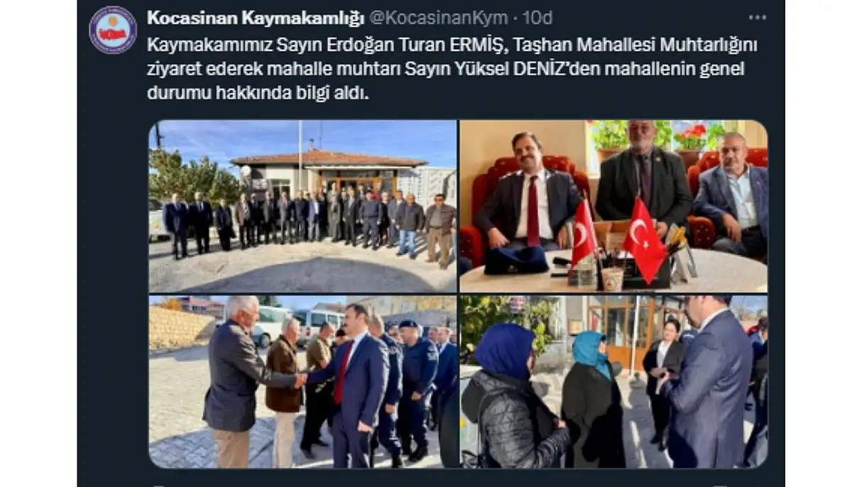 Kaymakamımız Erdoğan Turan ERMİŞ, Taşhan Mahallesi Muhtarlığını ziyaret ederek mahalle muhtarı Yüksel DENİZ’den mahallenin genel durumu hakkında bilgi aldı.