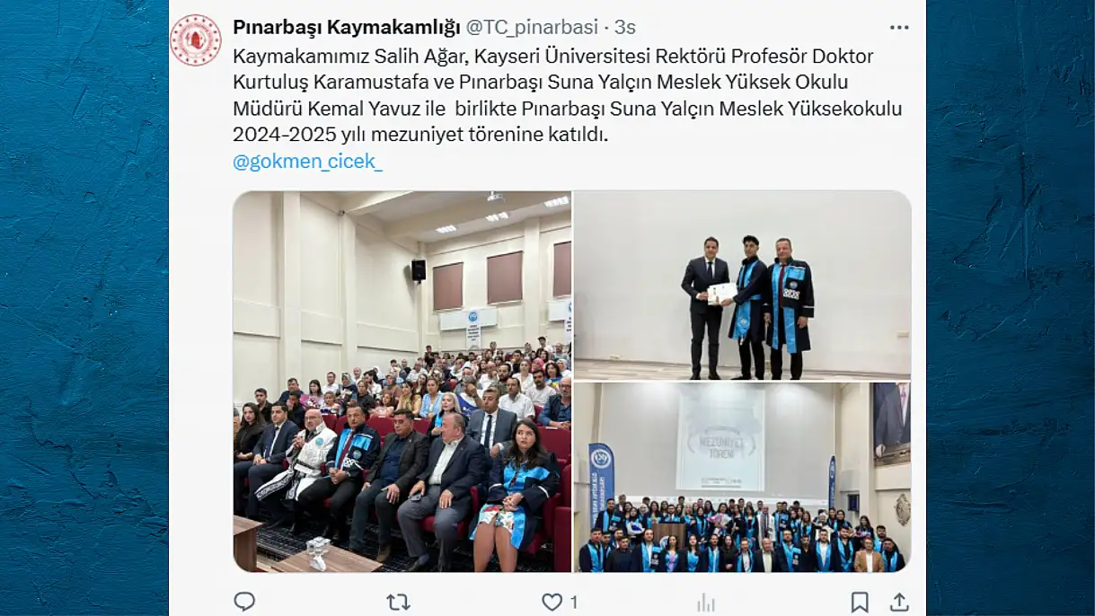 Pınarbaşı Kaymakamı Salih Ağar, Kayseri Üniversitesi Rektörü Profesör Doktor Kurtuluş Karamustafa ve Pınarbaşı Suna Yalçın Meslek Yüksek Okulu Müdürü Kemal Yavuz ile birlikte Pınarbaşı Suna Yalçın Meslek Yüksekokulu 2024-2025 yılı mezuniyet törenine katıldı.