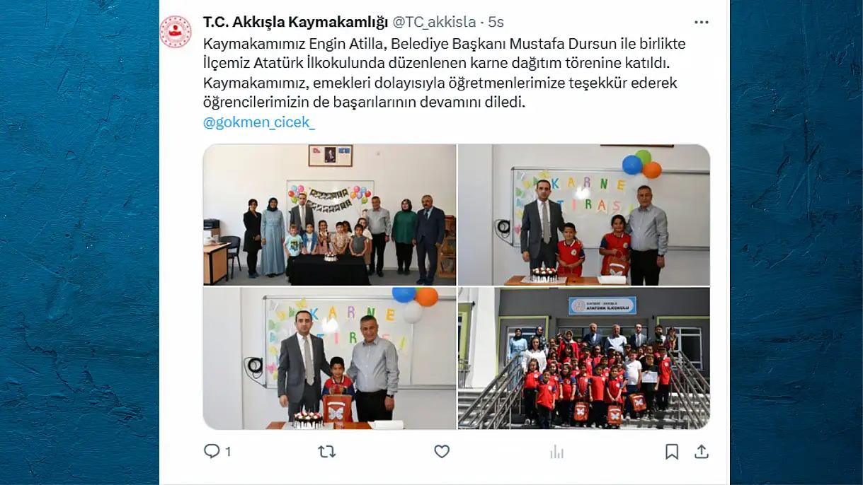 Kaymakam Engin Atilla, Belediye Başkanı Mustafa Dursun ile birlikte Atatürk İlkokulunda düzenlenen karne dağıtım törenine katıldı. Kaymakam Atilla emekleri dolayısıyla öğretmenlere teşekkür ederek öğrencilere de başarılarının devamını diledi.