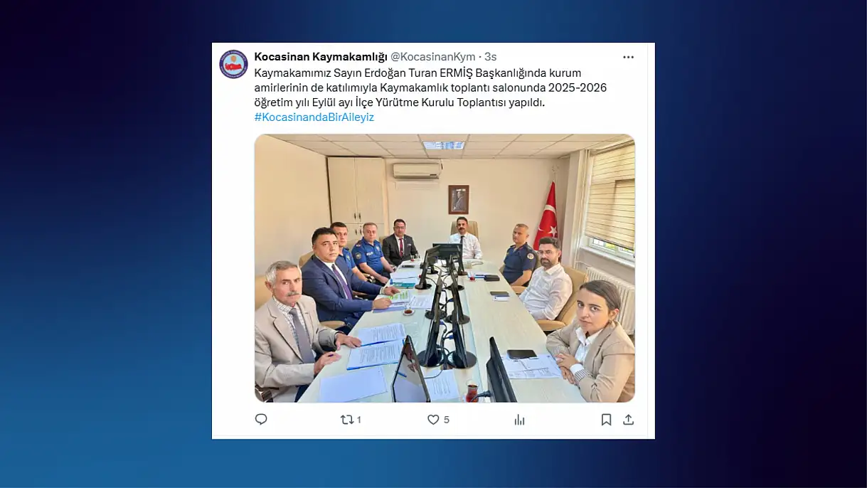 Kocasinan Kaymakamı Erdoğan Turan Ermiş Başkanlığında kurum amirlerinin de katılımıyla Kaymakamlık toplantı salonunda 2025-2026 öğretim yılı Eylül ayı İlçe Yürütme Kurulu Toplantısı gerçekleştirildi.