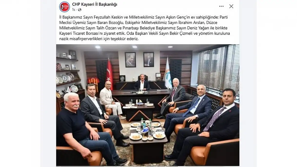 CHP Kayseri İl Başkanı Feyzullah Keskin ve Milletvekili Aşkın Genç’in ev sahipliğinde; Parti Mecli Üyesi Baran Bozoğlu, Eskişehir Milletvekili İbrahim Arslan, Düzce Milletvekili Talih Özcan ve Pınarbaşı Belediye Başkanı Deniz Yağan ile birlikte Kayseri Ticaret Borsası’nı ziyaret etti.