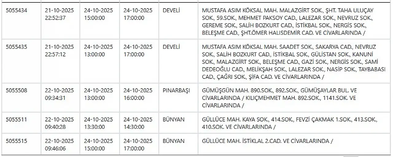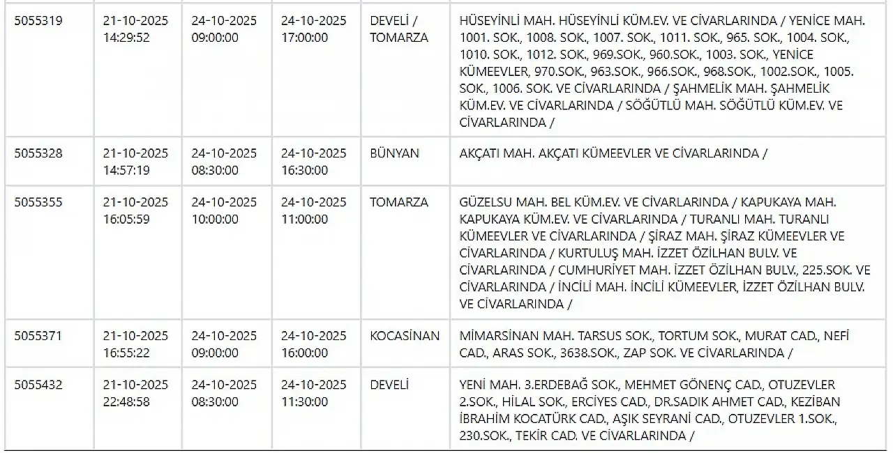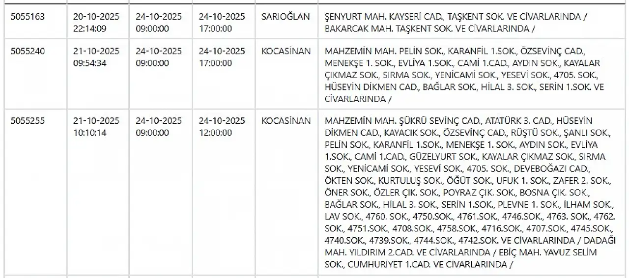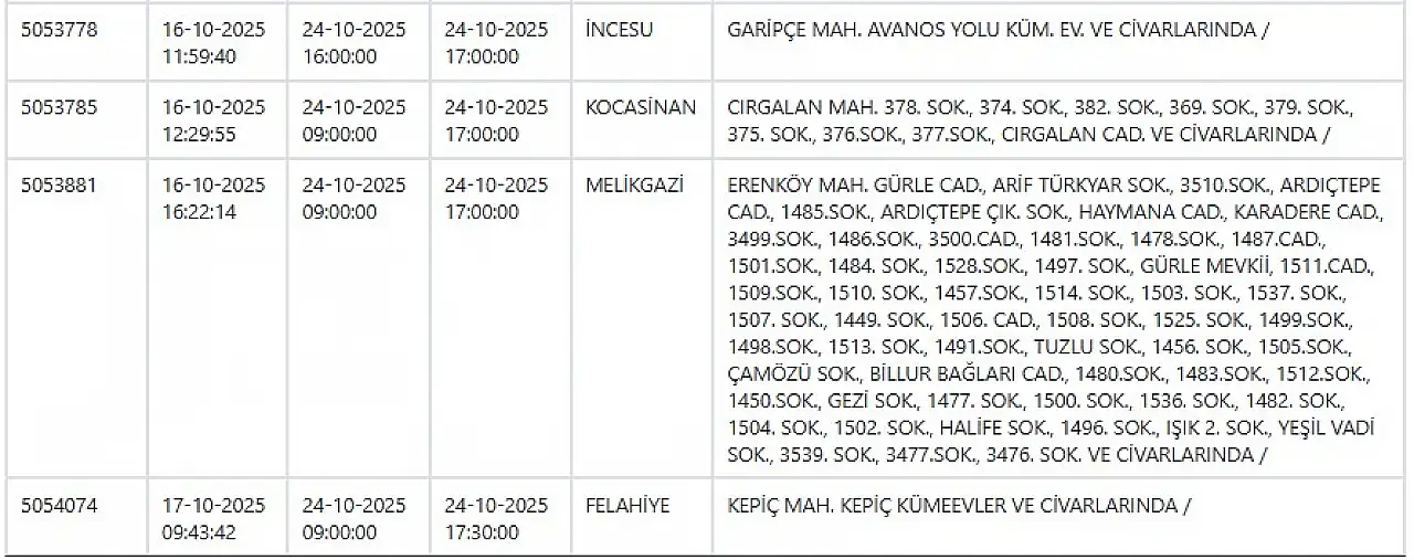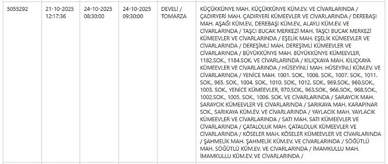 KCETAŞ’tan edinilen bilgilere göre yarın (24 Ekim 2025) aşağıdaki mahallelerde elektrik kesintisi yaşanacak.