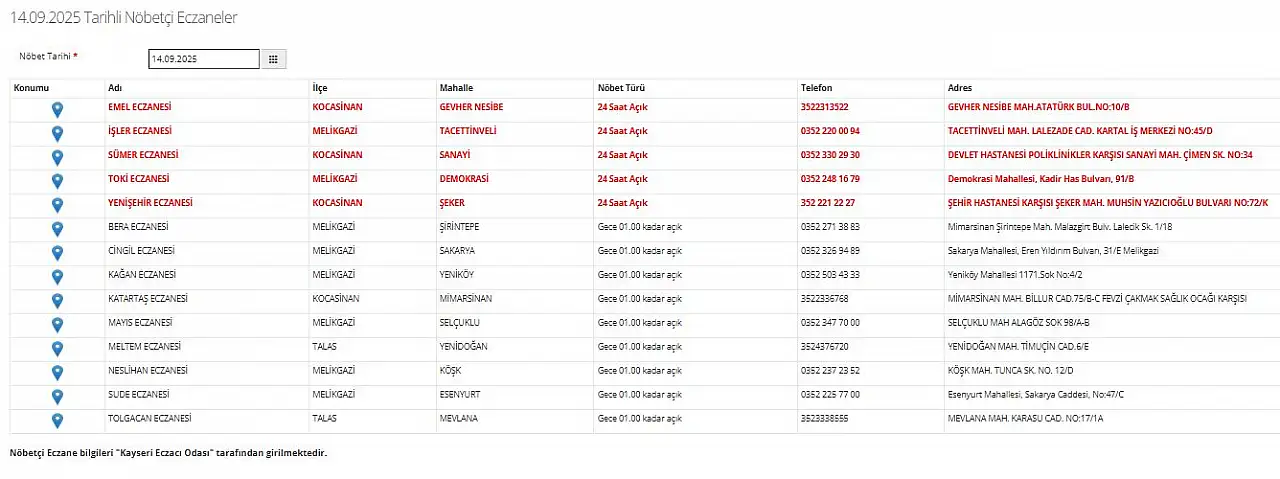 Kayseri Nöbetçi Eczaneler (14 Eylül 2025)