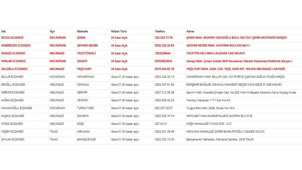 Kayseri Eczacı Odası tarafından Kayseri'de 16 Aralık 2025 tarihinde hizmet verecek nöbetçi eczaneler belli oldu. Kocasinan, Melikgazi ve Talas ilçesinde gece 01.00'a kadar ve 24 saat açık şekilde hizmet verecek. Nöbetçi eczaneler aşağıdaki gibidir,