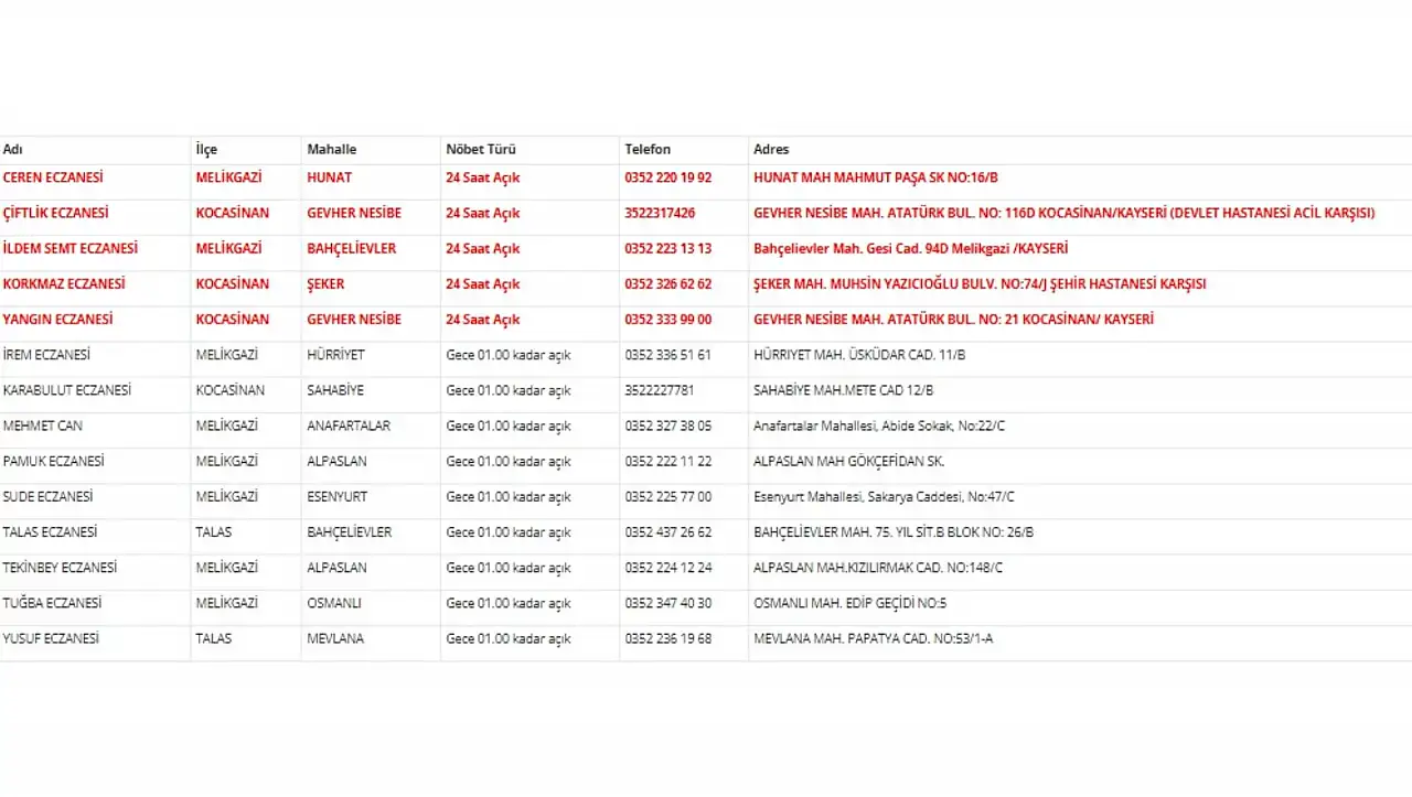 Kayseri Eczacı Odası 25 Aralık 2025 tarihli nöbetçi eczane listesini yayımladı. Melikgazi, Talas ve Kocasinan ilçelerinde 14 farklı noktada nöbetçi eczane hizmet verecek.