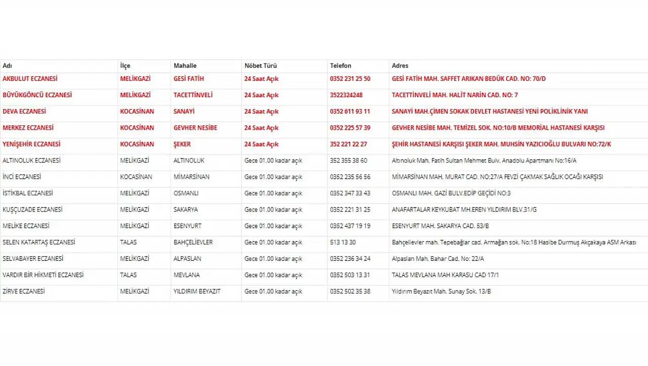 Kayseri nöbetçi eczaneler (26 Aralık Cuma)
