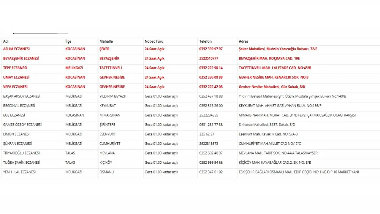 Kayseri'de 29 Ocak 2026 Perşembe günü nöbetçi eczaneler açıklandı. Melikgazi, Kocasinan ve Talas ilçelerinde hizmet veren eczanelerin listesi. Detaylar haberimizde...