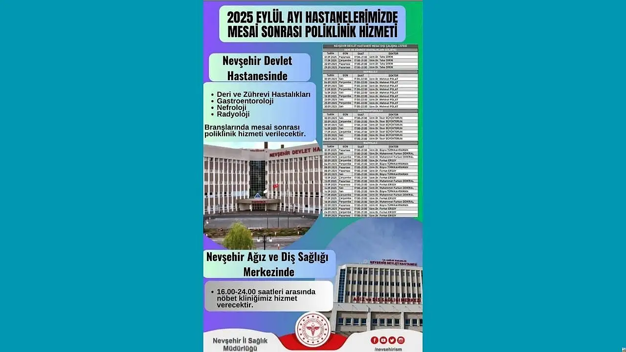 Nevşehir Ağız ve Diş Sağlığı Merkezi’nde ise 16.00–24.00 saatleri arasında nöbetçi klinikler devrede olacak. Uygulama, özellikle işten geç çıkan vatandaşlar için büyük kolaylık sağlayacak.