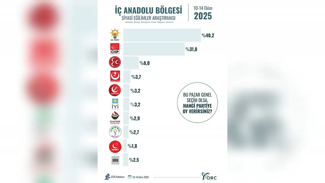 ORC Araştırma Şirketi, ‘‘İç Anadolu Bölgesi Siyasi Eğilimler Araştırması’‘ adıyla yürüttüğü çalışmayı 10–14 Ekim 2025 tarihleri arasında gerçekleştirdi. Anket; Ankara, Konya, Eskişehir, Sivas, Kayseri ve Çorum illerinde toplam 2 bin 375 kişiyle yapıldı. Katılımcılara ‘‘Bu pazar genel seçim olsa hangi partiye oy verirsiniz?’‘ sorusu yöneltildi.