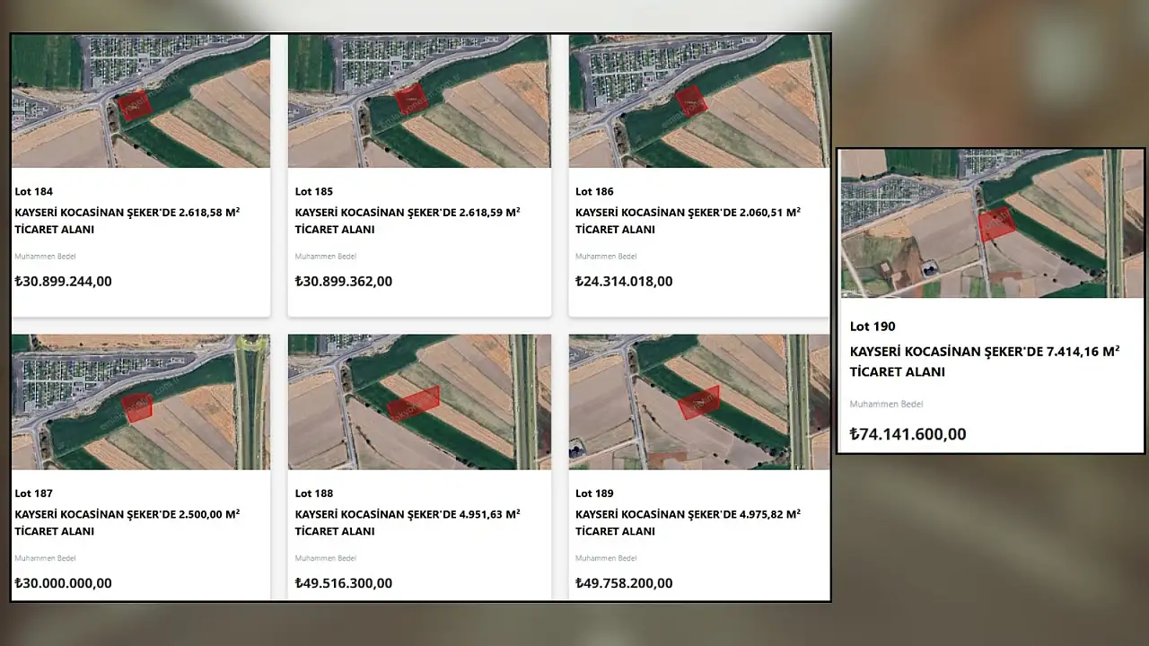 Kayseri’de satışa çıkarılan muhtelif arsalar arasında, Kocasinan ilçesinde yer alan 7 ayrı ticaret alanı nitelikli arsa dikkat çekti. Büyük çoğunluğu bitişik ve birbirine yakın konumda bulunan taşınmazların yüzölçümleri farklılık gösterirken, arsaların Şeker Mahallesi’nde, Şeker Hobi Bahçesi ve Kayseri Şehir Hastanesi’ne yakın bir konumda yer aldığı görüldü. Ticari potansiyeli yüksek olduğu değerlendirilen arsalar için milyonlarca liralık bedel biçildi.