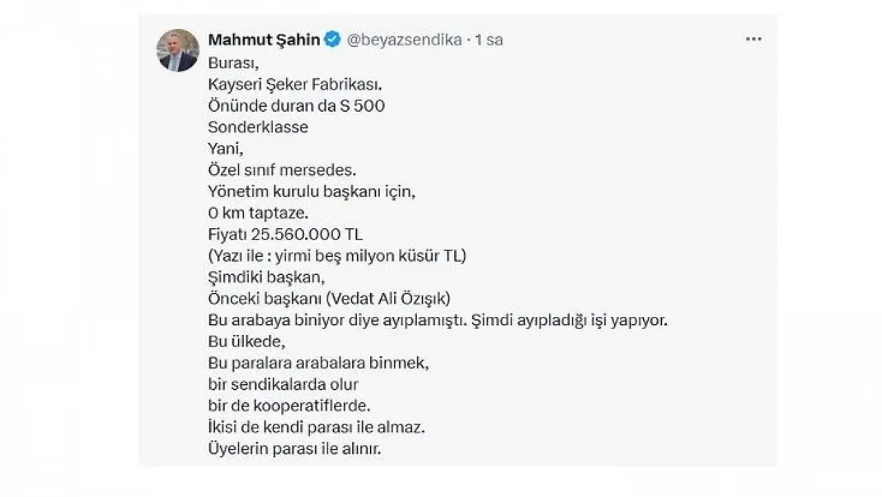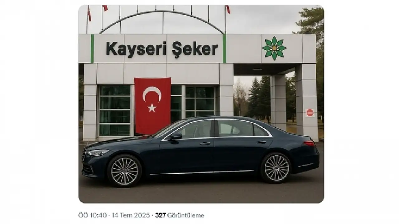 Fotoğrafta, fabrikanın önünde duran sıfır kilometre, özel sınıf bir Mercedes S500 yer alıyor. Şahin, bu aracın Kayseri Şeker Fabrikası Yönetim Kurulu Başkanı için alındığını ve değerinin yaklaşık 25 milyon 560 bin TL olduğunu söyledi.