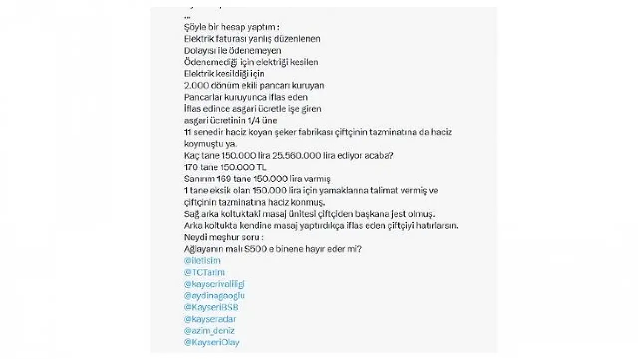 Tüketiciler Birliği Genel Başkanı Mahmut Şahin, sosyal medya hesabından Kayseri Şeker Fabrikası önünde çekilen bir fotoğrafı paylaşarak dikkat çeken bir eleştiride bulundu.