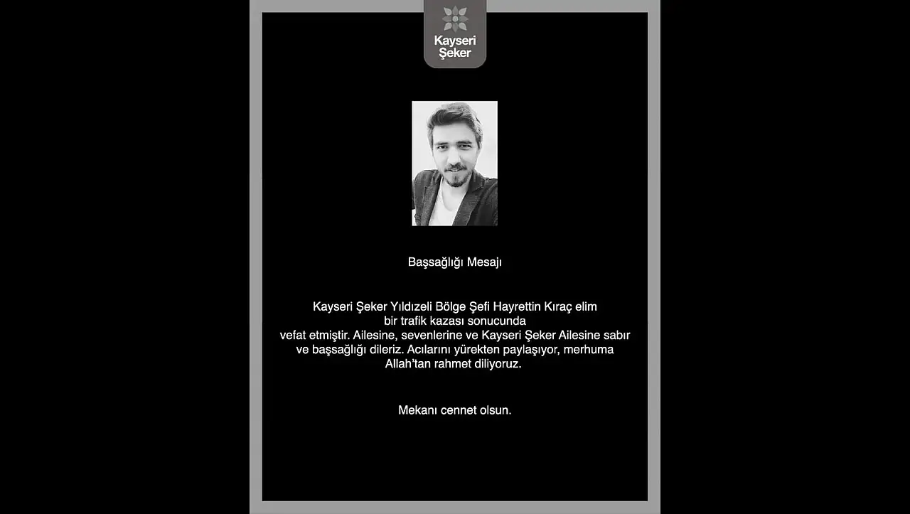 Kayseri Şeker sosyal medya hesabından yayınladığı gönderi ile Kayseri Şeker Yıldızeli Bölge Şefi Hayrettin Kıraç’ın hayatını kaybettiğini duyurdu.