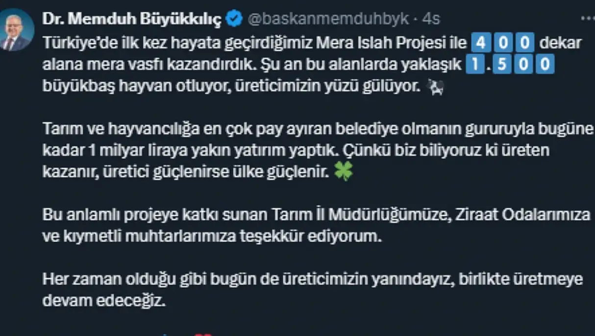 Türkiye’de ilk kez hayata geçirilen Mera Islah Projesi ile 400 dekar alana mera vasfı kazandırıldı. Şu an bu alanlarda yaklaşık bin 500 büyükbaş hayvan otluyor.