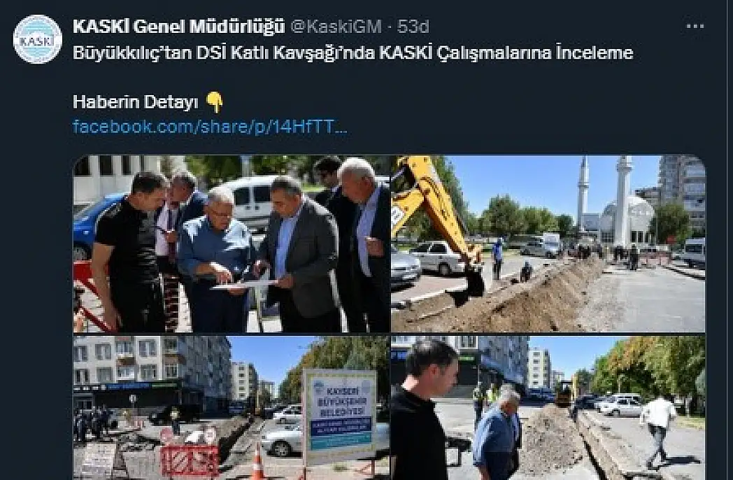 Kayseri Büyükşehir Belediyesi Su Ve Kanalizasyon İdaresi Genel Müdürlüğü (KASKİ) sosyal medya hesabından yapılan paylaşımda DSİ Katlı Kavşak çalışmalarına ilişkin bilgi paylaşıldı.