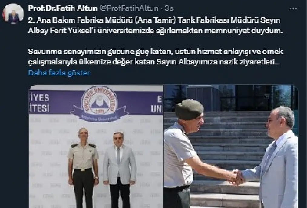 Erciyes Üniversitesi Rektörü Fatih Altun, 2. Ana Bakım Fabrika Müdürü (Ana Tamir) Tank Fabrikası Müdürü Albay Ferit Yüksel’i üniversitede ağırlamaktan memnuniyet duyduğunu belirten bir paylaşım yaptı.