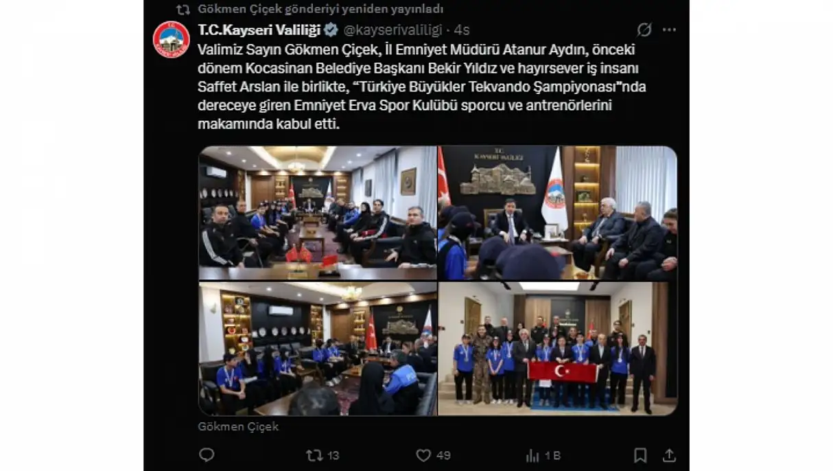 'Valimiz Sayın Gökmen Çiçek, İl Emniyet Müdürü Atanur Aydın, önceki dönem Kocasinan Belediye Başkanı Bekir Yıldız ve hayırsever iş insanı Saffet Arslan ile birlikte, “Türkiye Büyükler Tekvando Şampiyonası”nda dereceye giren Emniyet Erva Spor Kulübü sporcu ve antrenörlerini makamında kabul etti.'