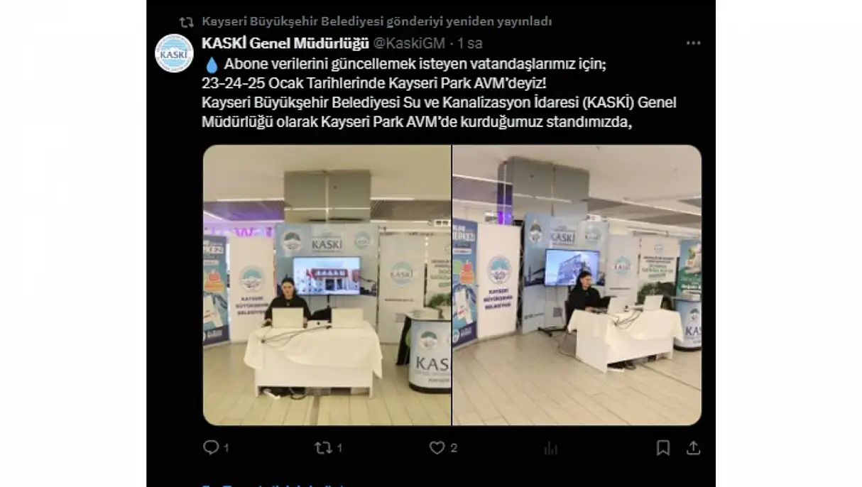 'Abone verilerini güncellemek isteyen vatandaşlarımız için; 23-24-25 Ocak Tarihlerinde Kayseri Park AVM’deyiz! Kayseri Büyükşehir Belediyesi Su ve Kanalizasyon İdaresi (KASKİ) Genel Müdürlüğü olarak Kayseri Park AVM’de kurduğumuz standımızda, abonelerimizin verilerini güncelleyerek hizmet süreçlerimiz hakkında bilgilendiriyor, merak edilen soruları yerinde yanıtlıyor, bilgilendirici broşürlerle su tasarrufuna dikkat çekiyoruz.'