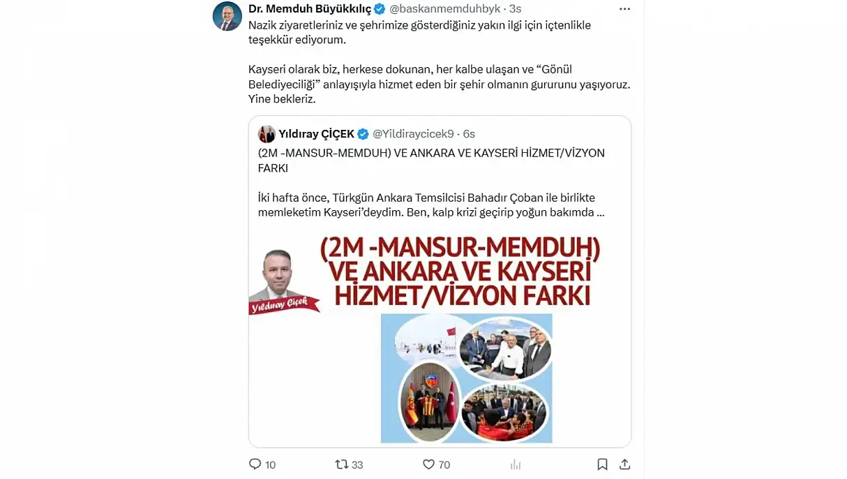Kayseri Büyükşehir Belediye Başkanı Memduh Büyükkılıç ‘Kayseri olarak herkese dokunan, her kalbe ulaşan ve Gönül Belediyeciliği anlayışıyla hizmet eden bir şehir olmanın gururunu yaşıyoruz’ dedi.