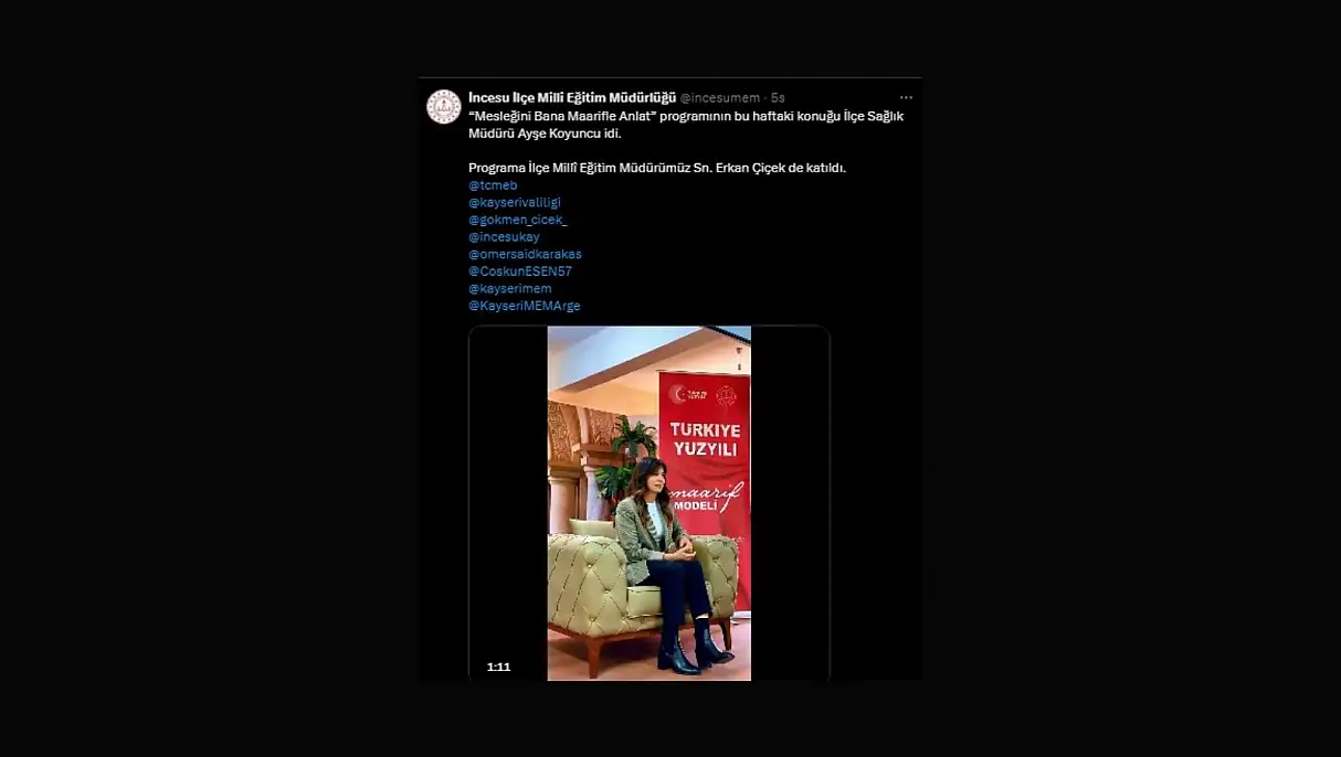 Mesleğini Bana Maarifle Anlat programının bu haftaki konuğu İlçe Sağlık Müdürü Ayşe Koyuncu oldu. Programa İlçe Millî Eğitim Müdürü Erkan Çiçek de katıldı.